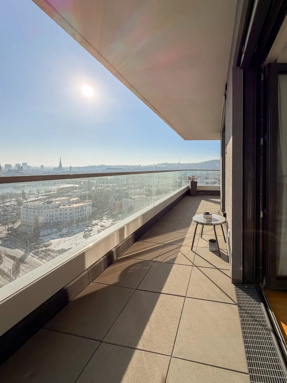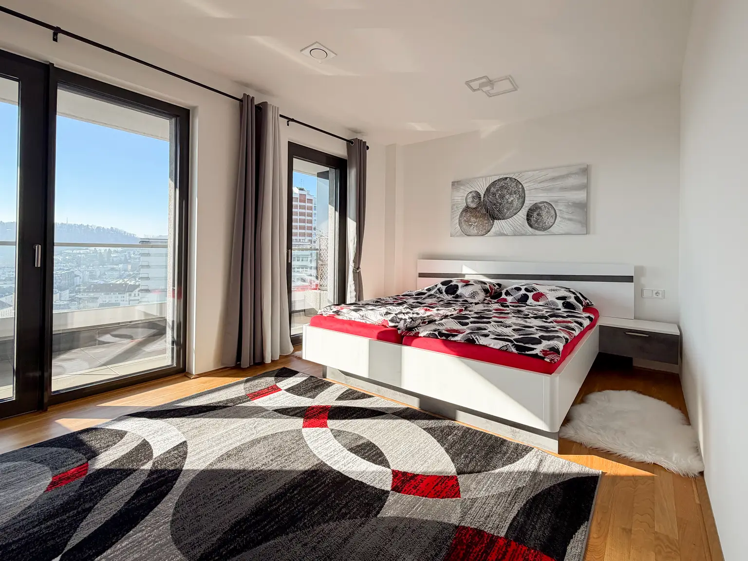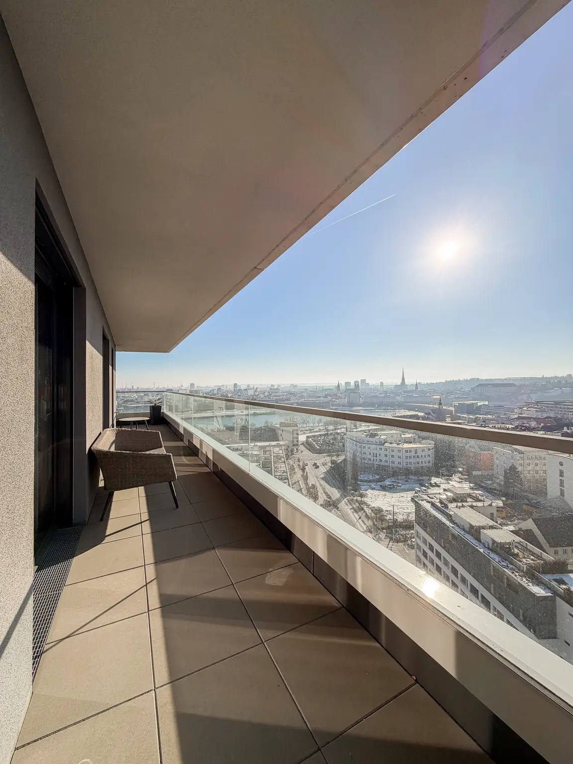 Die Wohnung befindet sich im 18. Obergeschoss des modernen Bruckner Towers und beeindruckt mit einem einzigartigen Weitblick über Linz. Der großzügige, rund 30 m² große Balkon in U-Form ist von jedem Zimmer aus begehbar und lädt dazu ein, den Sonnenlauf zu genießen und den herrlichen Panoramablick auf die Donau, den Pöstlingberg und die Stadt zu erleben.