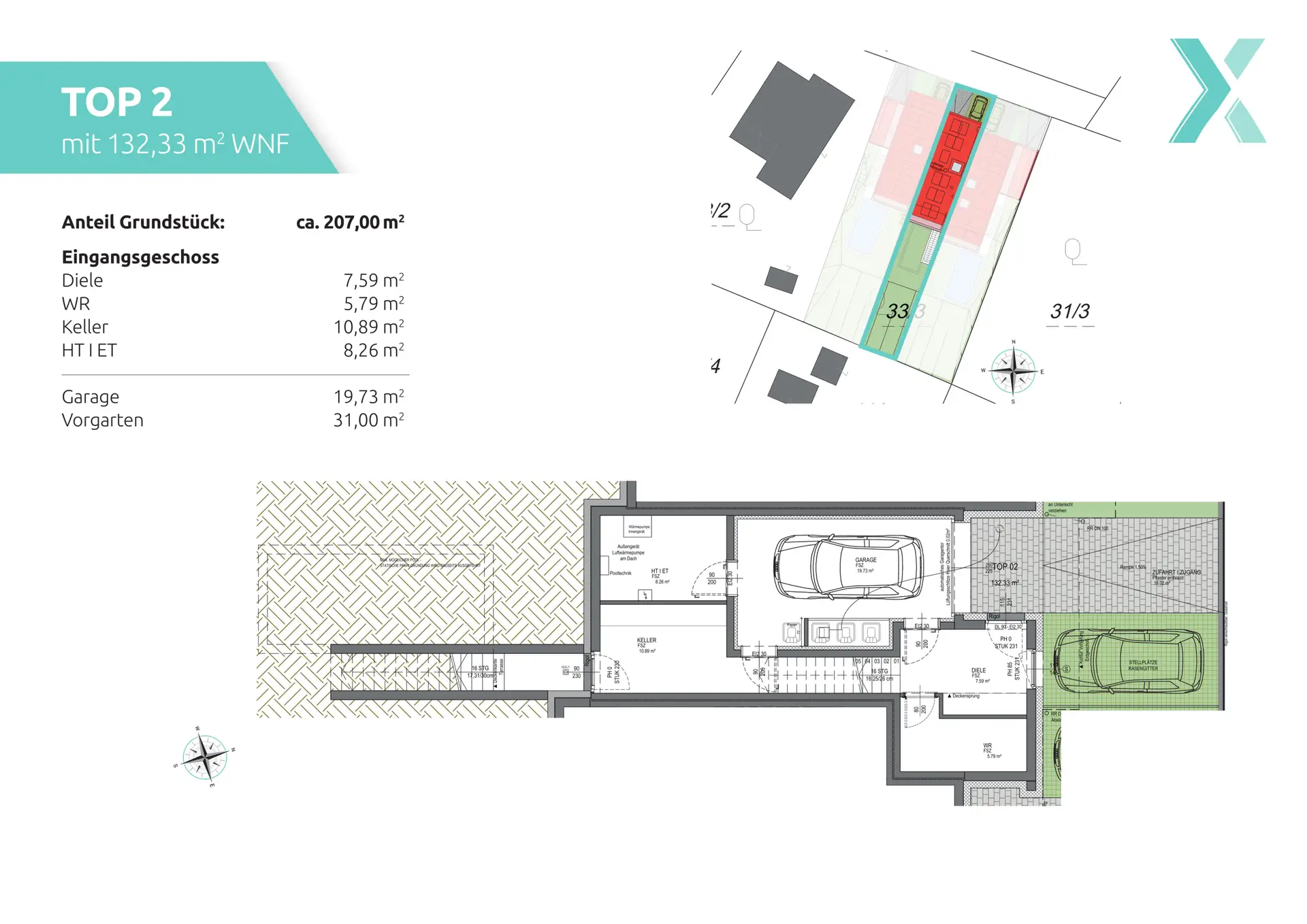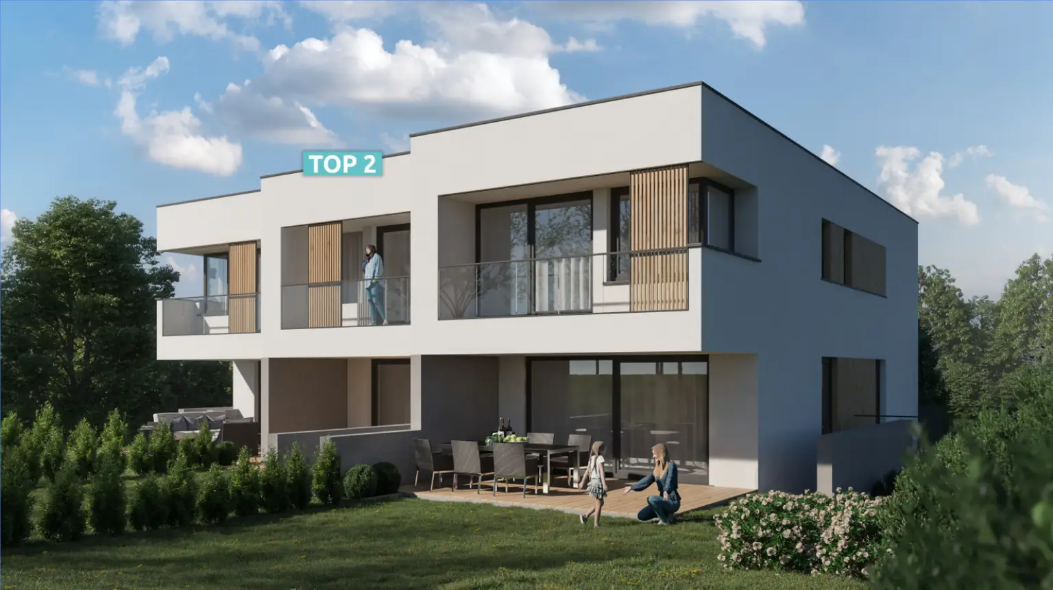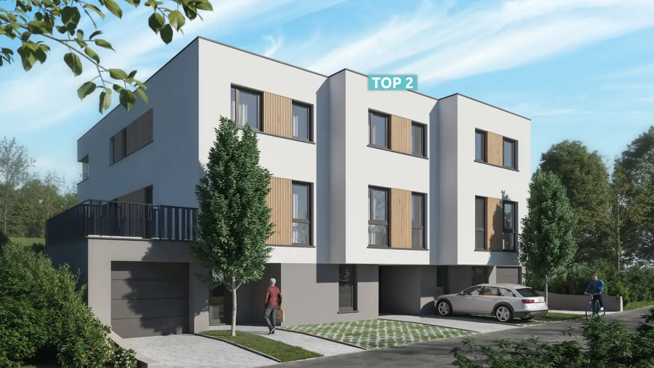 Jedes Haus verfügt über eine Garage, einen Stellplatz im Freien und einen kleinen Vorgarten. TOP 1 und TOP 3 verfügen zusätzlich über eine zweite Terrasse, die über das Esszimmer zugänglich ist.