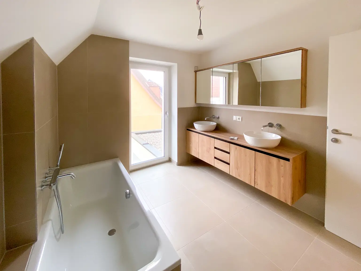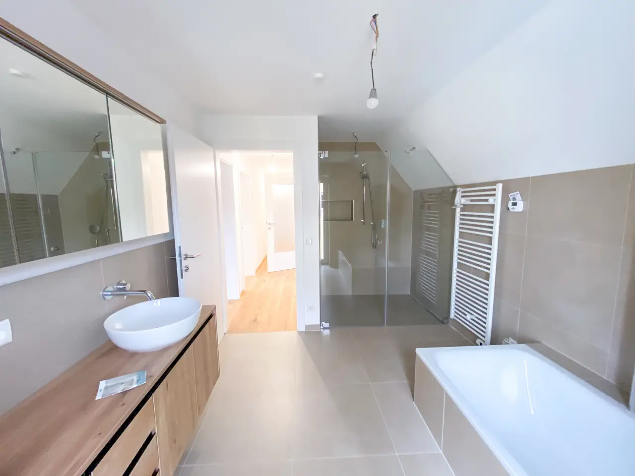 • Großzügiges, modernes Badezimmer mit Doppelwaschtisch, Badewanne und barrierefreier Dusche