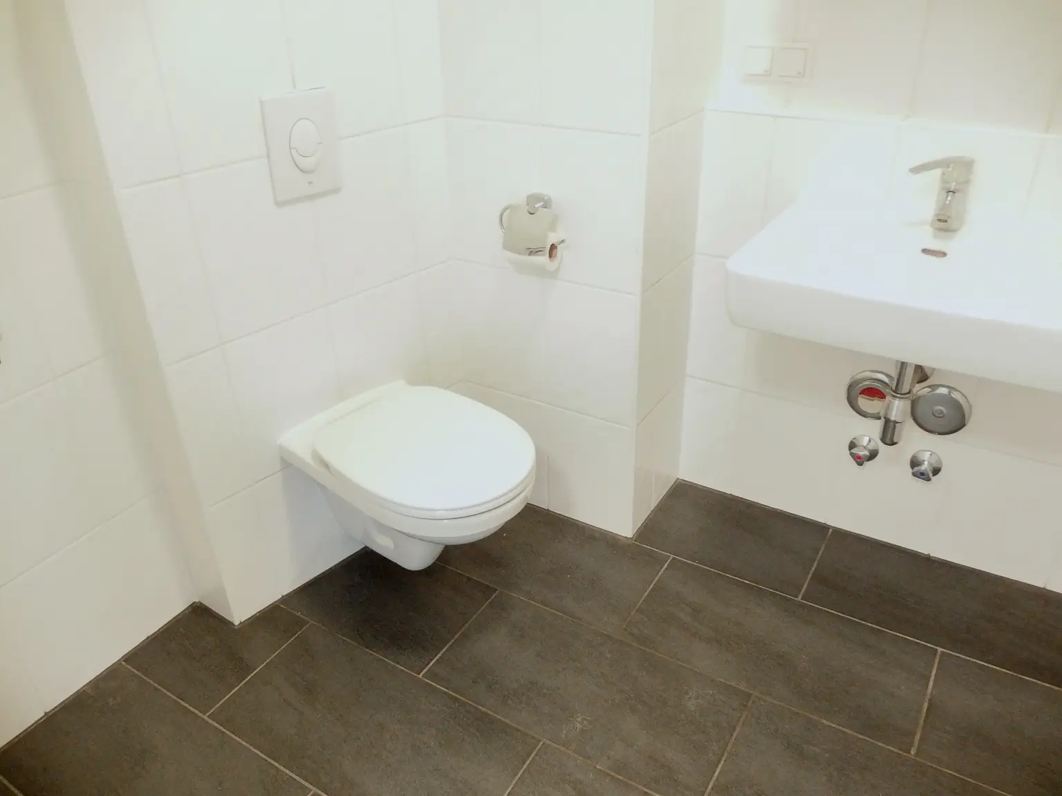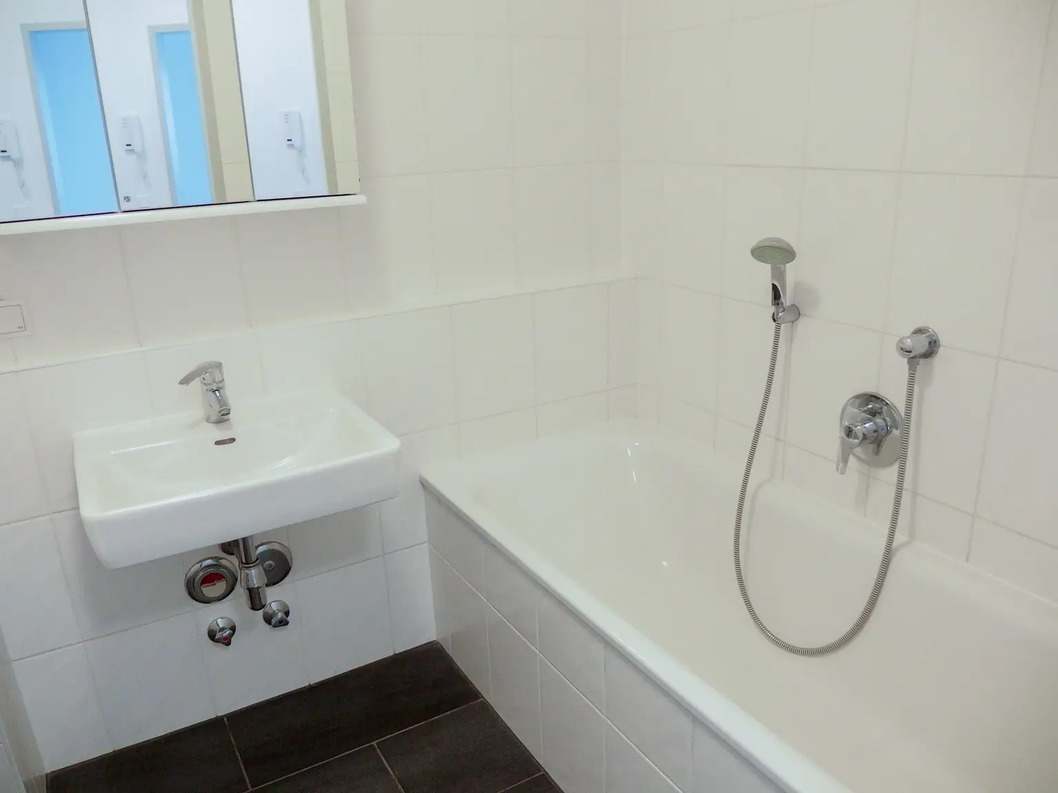 - Badezimmer mit Badewanne, WC und Waschmaschinenanschluss