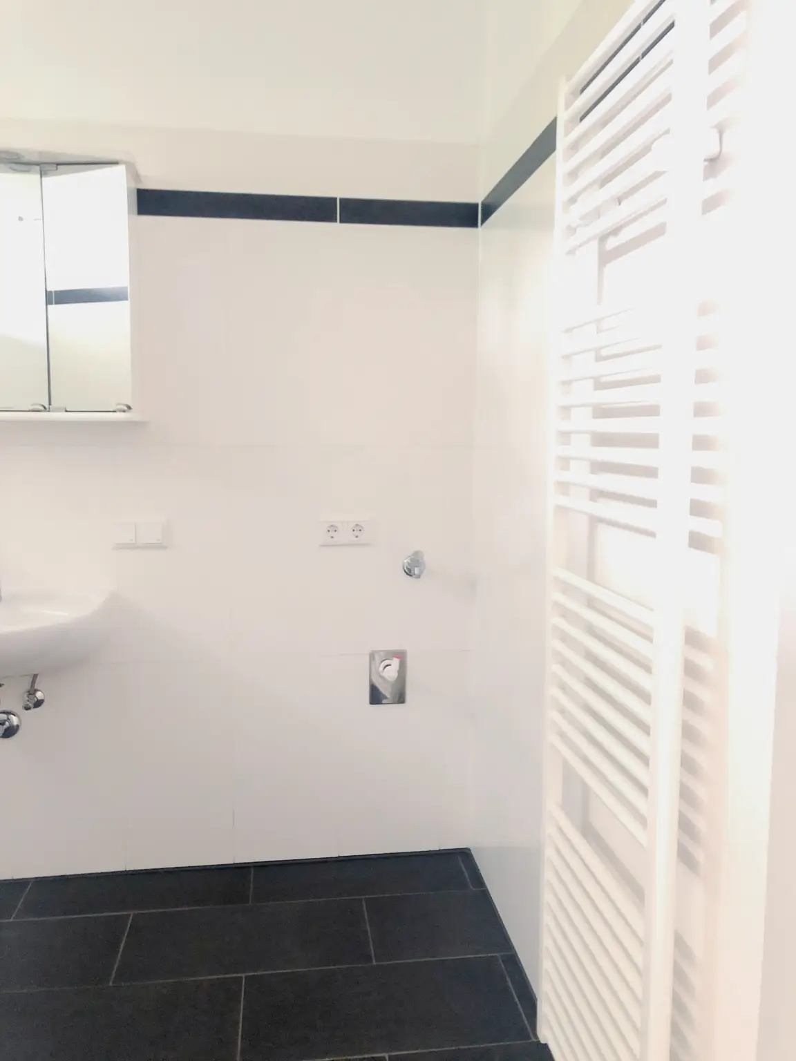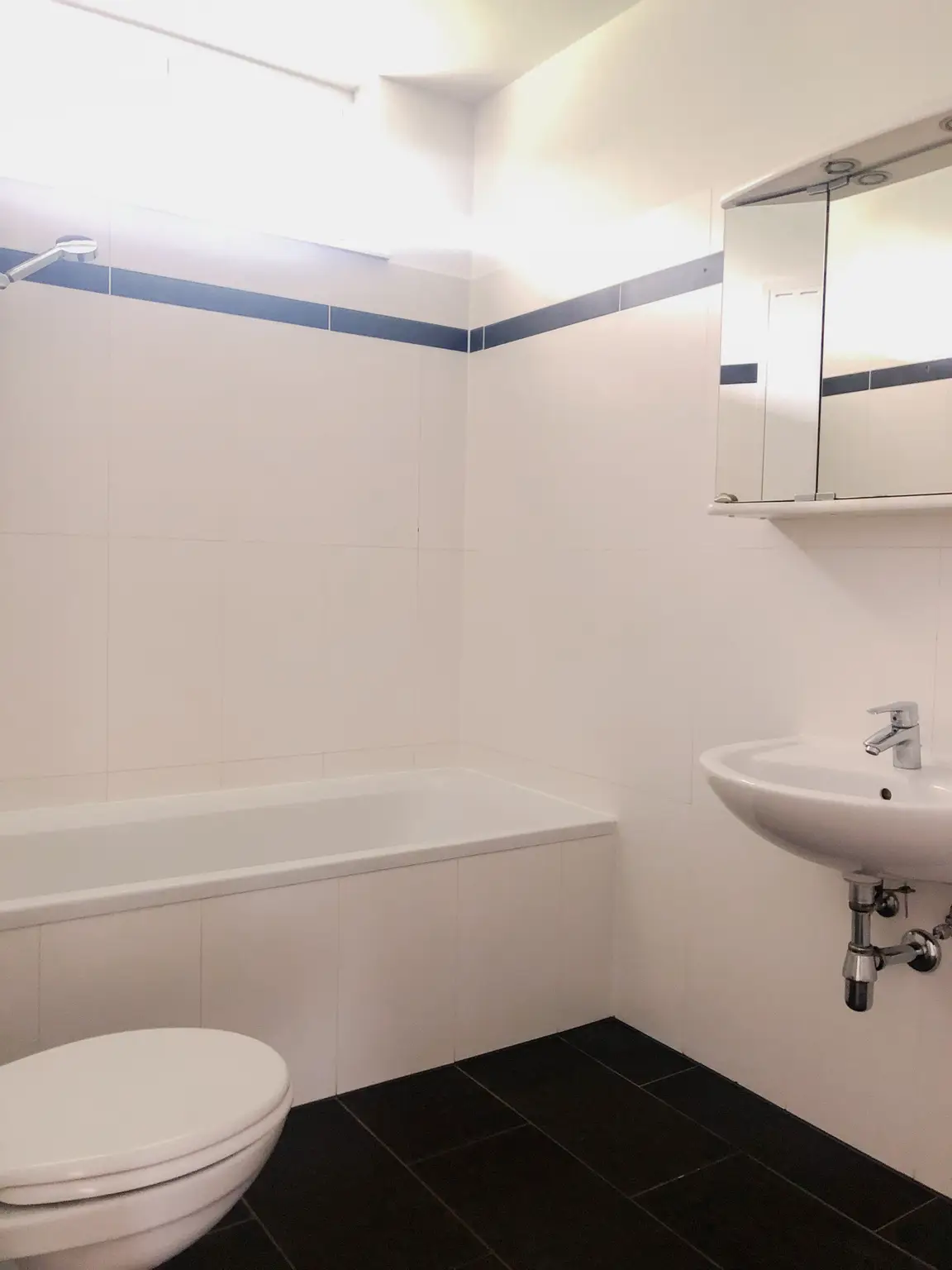 - Badezimmer mit Badewanne, WC und Waschmaschinenanschluss