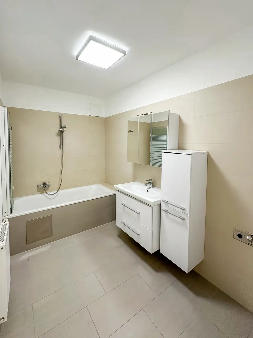Die Wohnung ist mit einer modernen Einbauküche ausgestattet, die nicht nur funktional ist, sondern auch zum geselligen Kochen und Verweilen einlädt. Genießen Sie entspannte Abende in der Badewanne, die Ihnen nach einem langen Tag die nötige Erholung bietet.