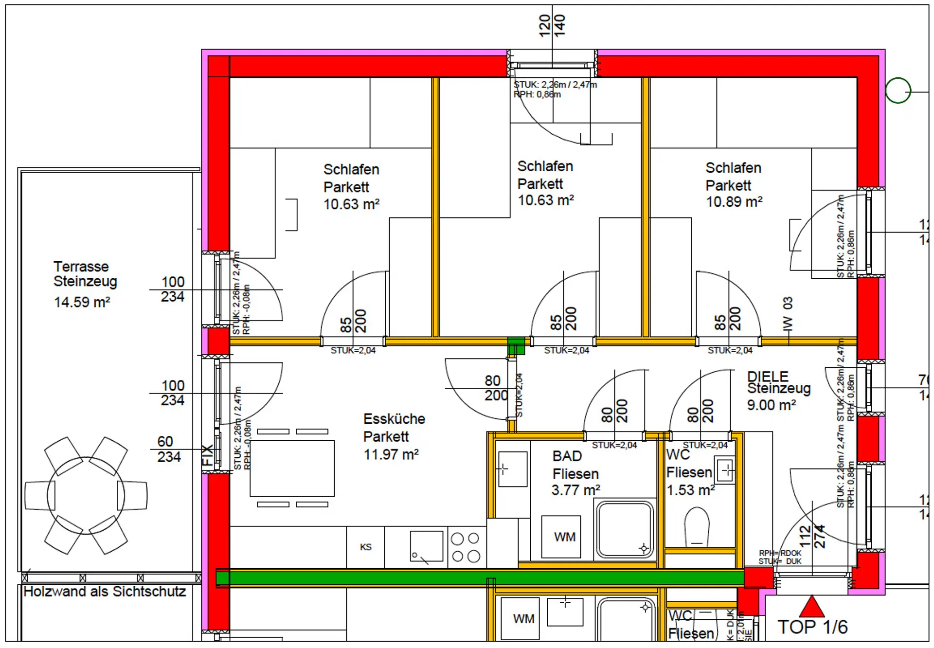 Jede Wohnung verfügt über eine moderne, möblierte Küche inklusive E-Geräten, sowie ein stilvoll ausgestattetes Badezimmer. Für zusätzlichen Stauraum sorgt ein eigenes Kellerabteil, das sich bequem im 1. Kellergeschoss befindet. Alle Wohnungen sind mit großzügigen Terrassen ausgestattet, die viel Freiraum im Freien bieten. Besonders hervorzuheben sind die fünf Penthouse-Wohnungen, die durch großzüge Grundrisse und herrliche Ausblicke überzeugen.
