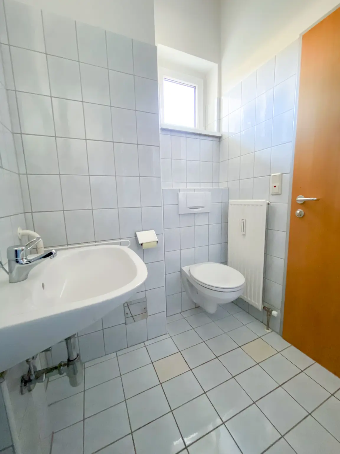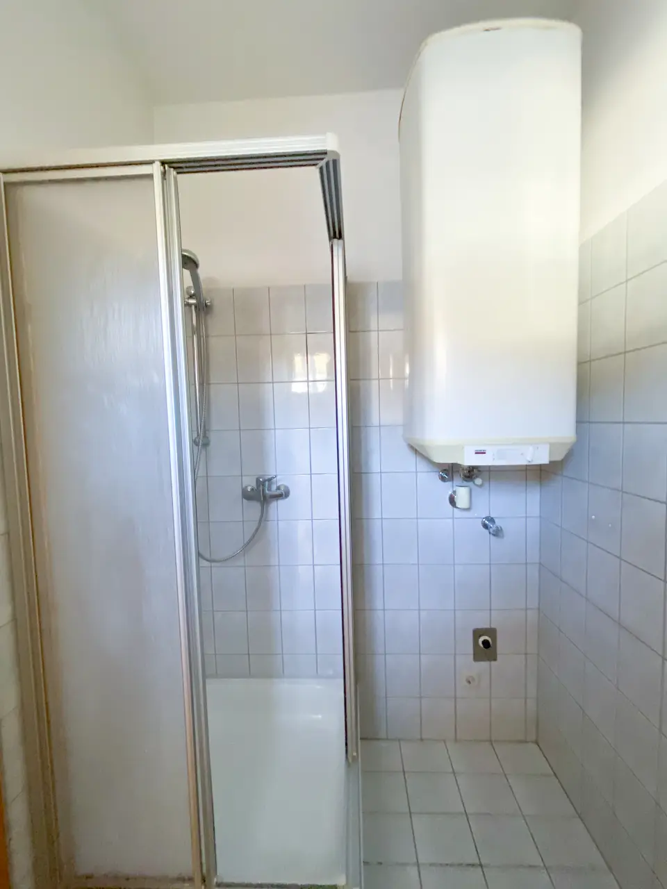 - schön verfliestes Badezimmer mit Dusche, Waschmaschinenanschluss und WC