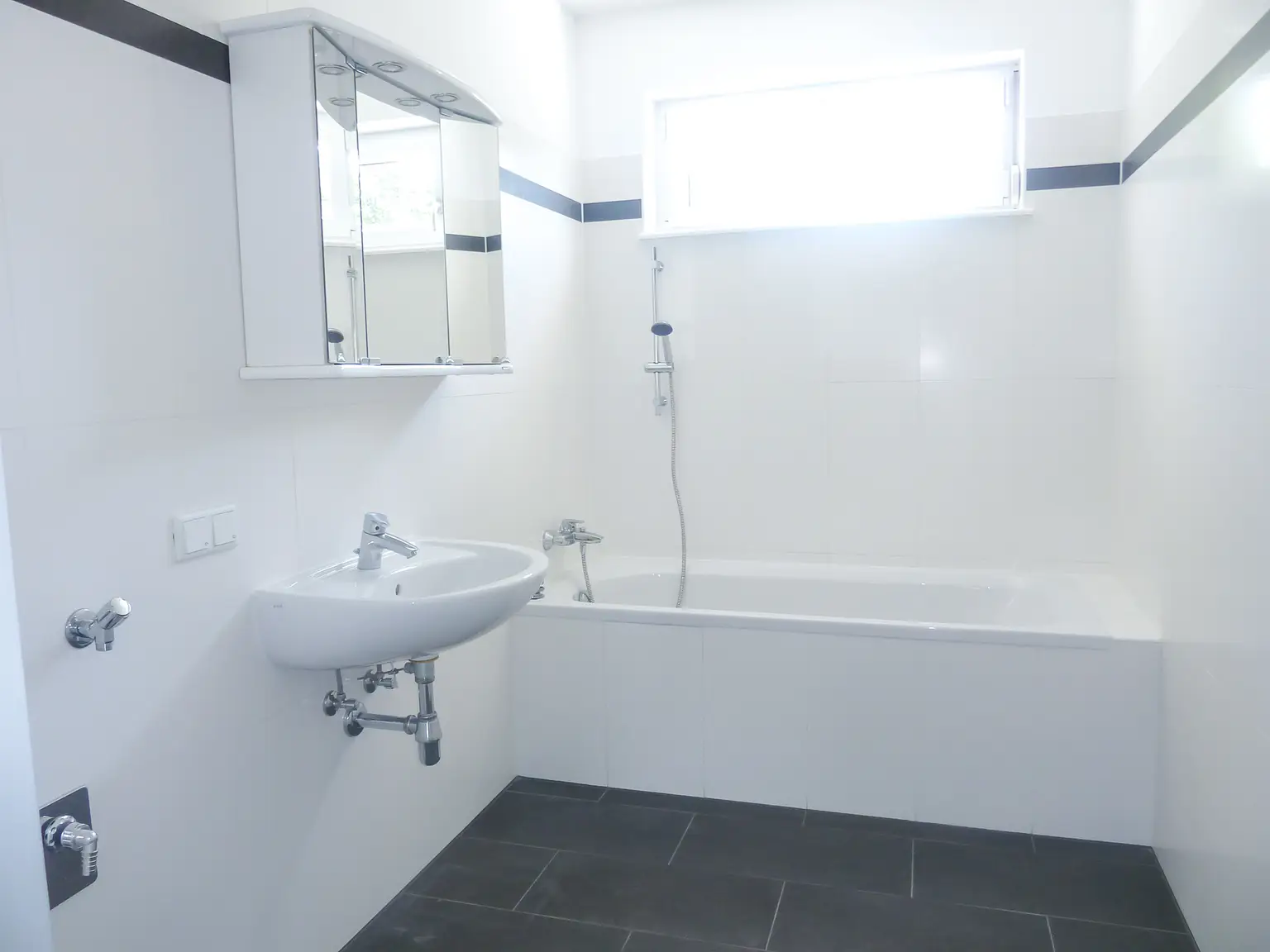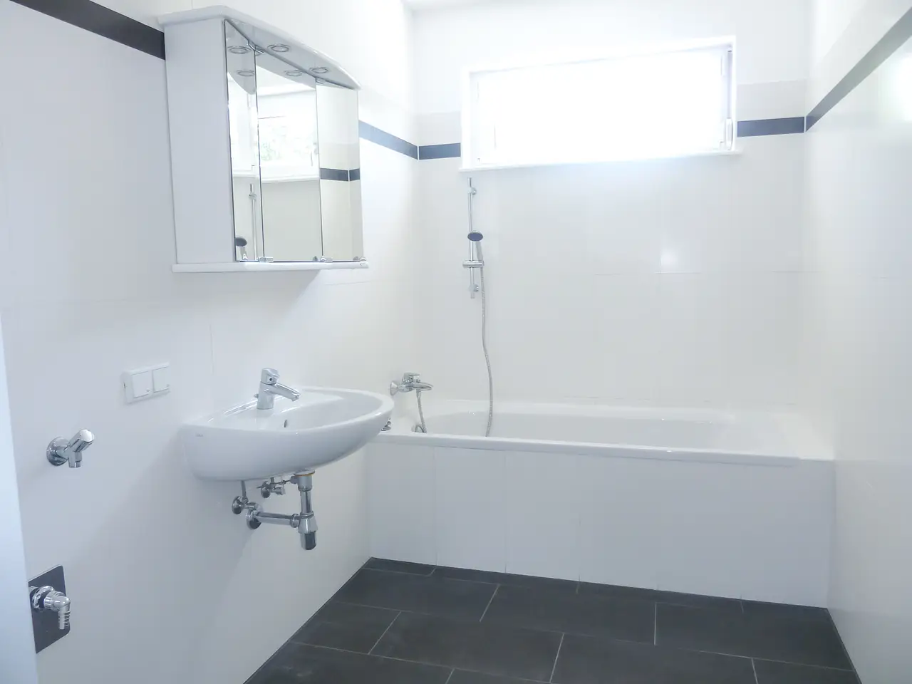- Badezimmer mit Badewanne und Waschmaschinenanschluss