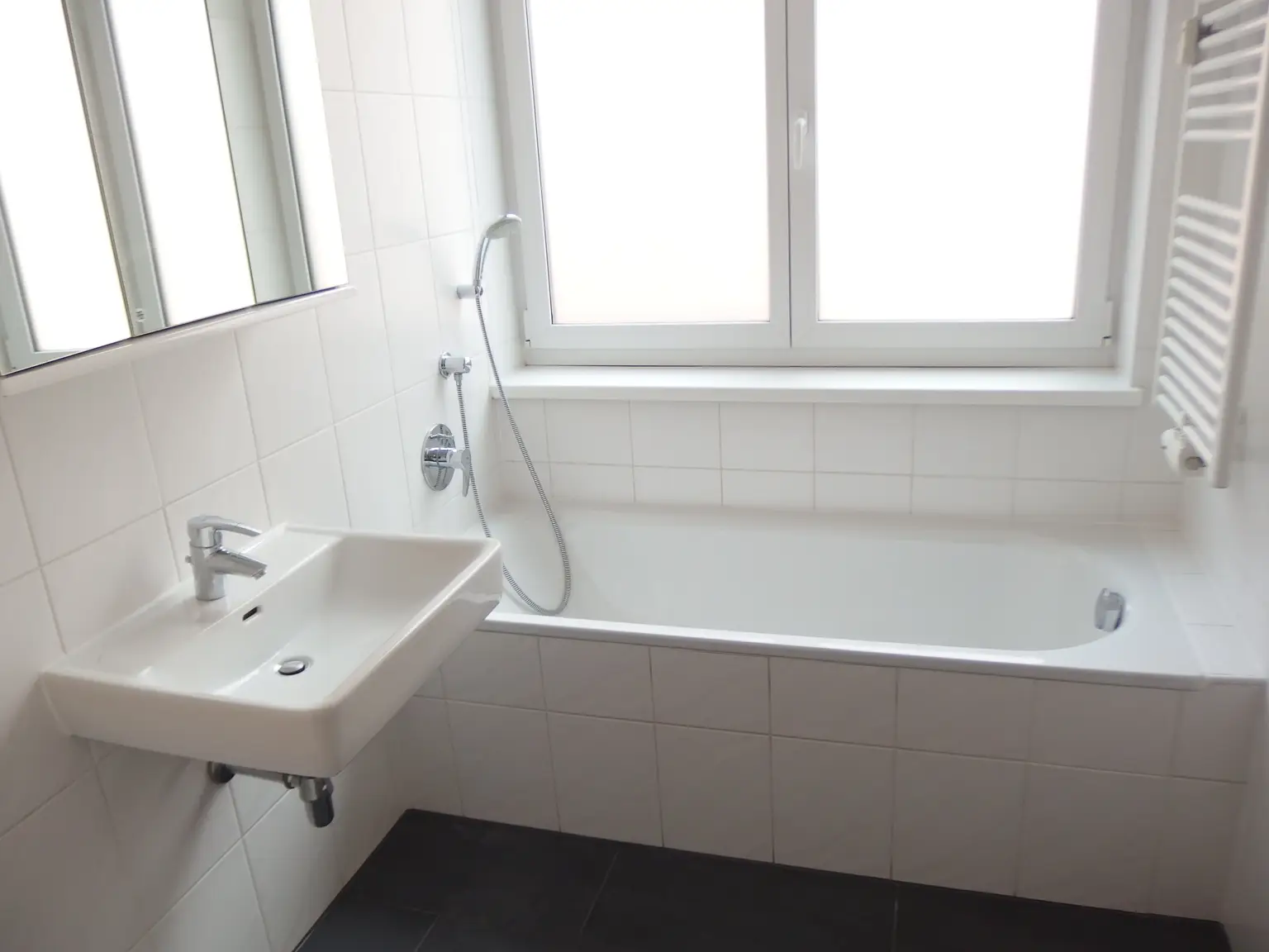 - Badezimmer mit Badewanne und Waschmaschinenanschluss, WC separat