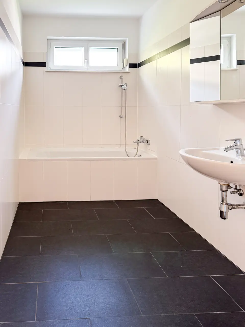 - Badezimmer mit Badewanne und Waschmaschinenanschluss